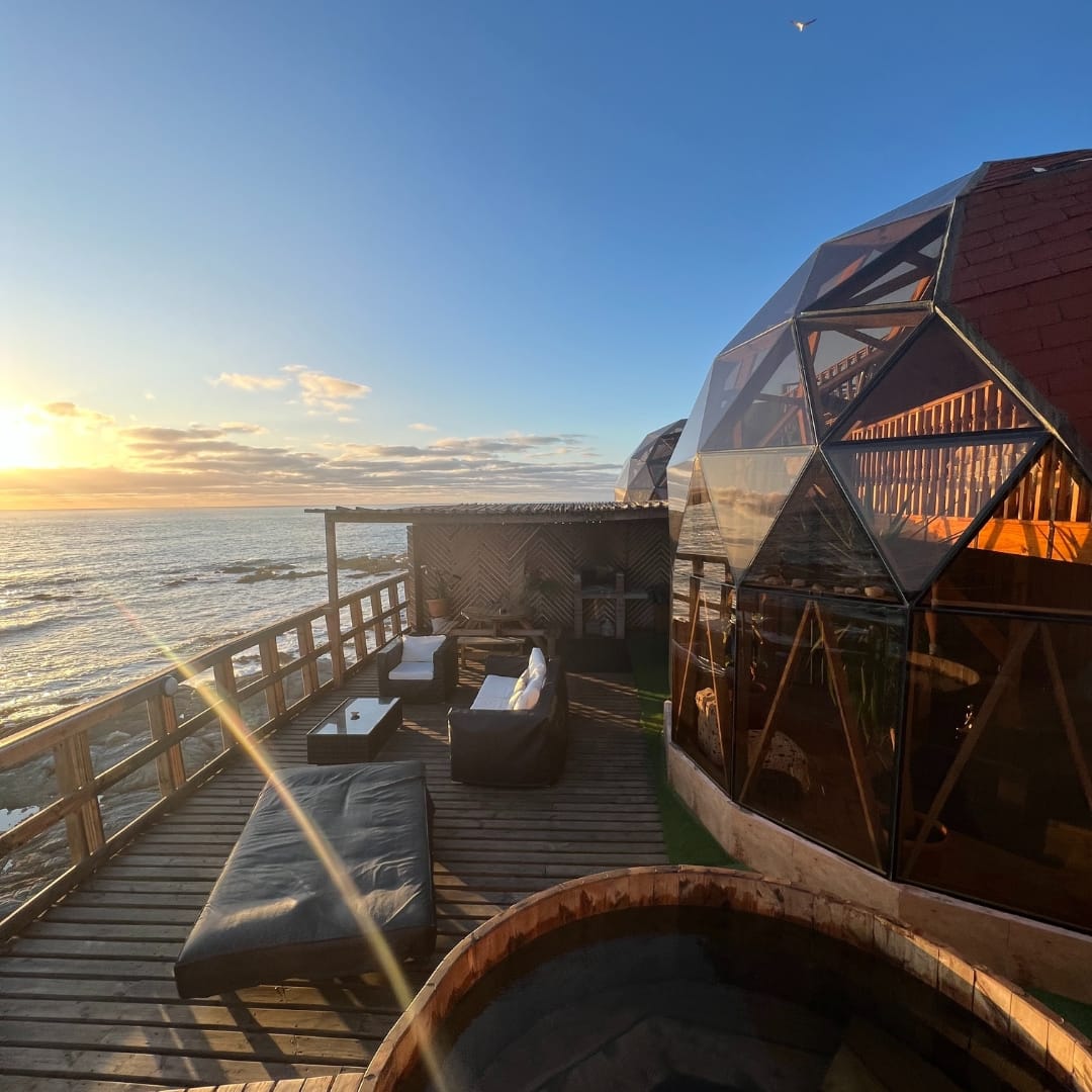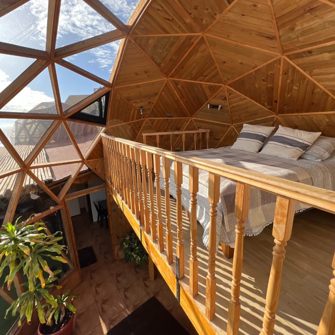 El Domo Sol es un alojamiento independiente para 2 personas equipado con aire acondicionado, cocina full equipada, baño privado, living, dormitorio y terraza exterior donde se encuentra una parrilla a carbón y una tinaja de agua caliente. La diferencia con nuestros otros alojamientos es que cuenta con una terraza más amplia.